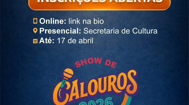 A Prefeitura de Indianópolis, por meio da Secretaria Municipal de Cultura, informa que estão abertas as inscrições para o Show de Calouros 2026, evento que integra a programação oficial da Festa de Maio, em comemoração ao aniversário de emancipação político-administrativa do município.